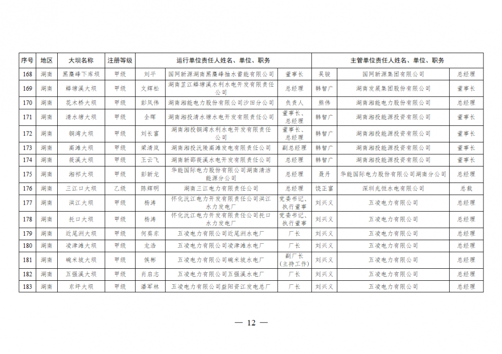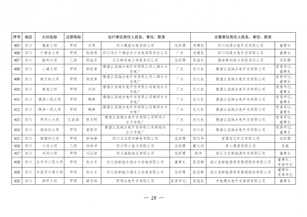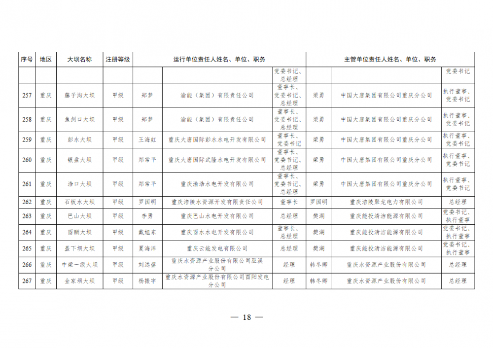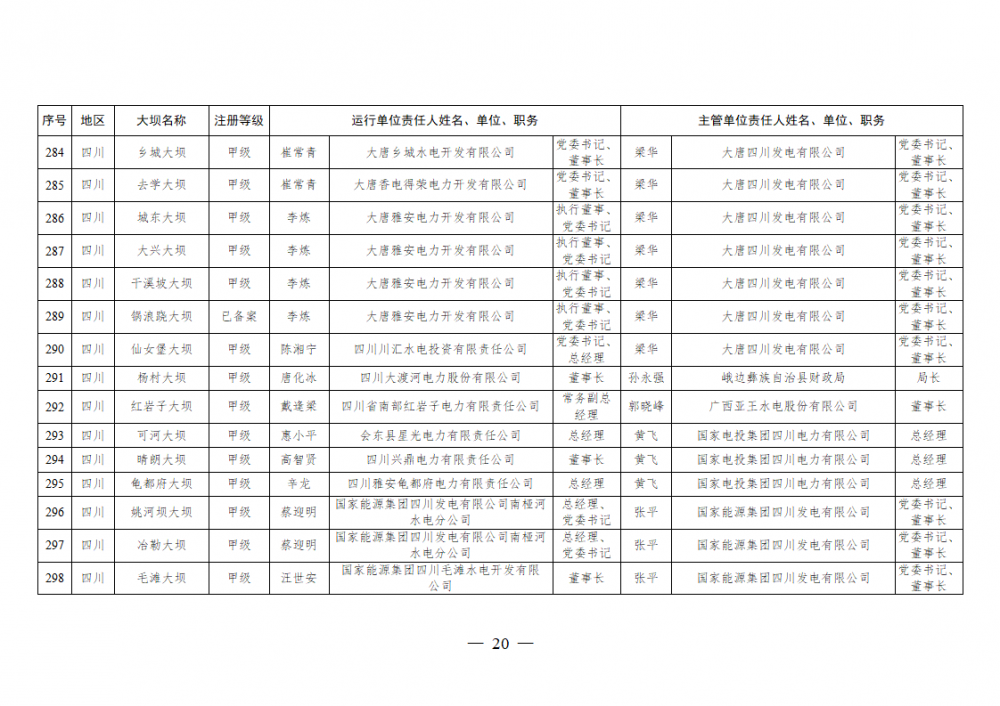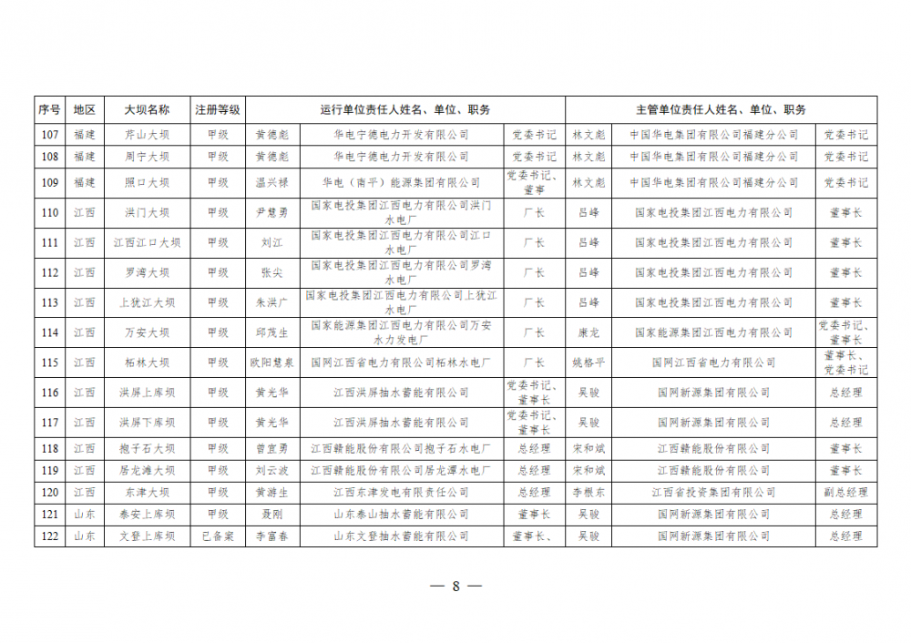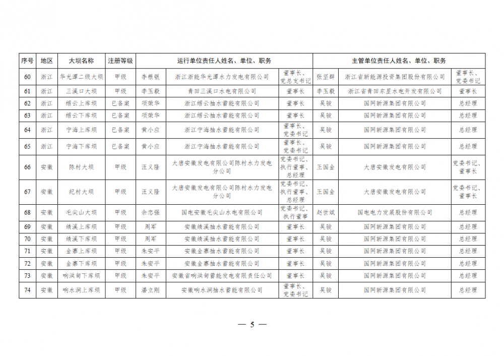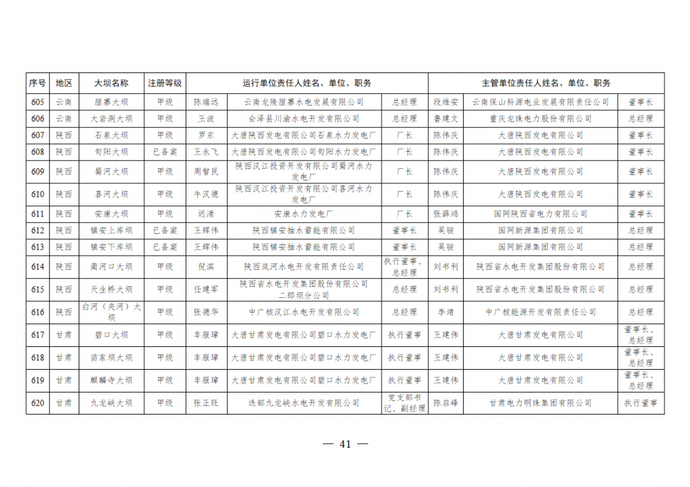 为进一步加强水电站大坝安全监督管理,压紧压实电力企业大坝安全主体责任,按照《水库大坝安全管理条例》《电力安全生产监督管理办法》(国家发展改革委令2015年第21号)、《水电站大坝运行安全监督管理规定》(国家发展改革委令2015年第23号)等规定要求,现将电力行业700座注册登记和登记备案的水电站大坝(以下简称大坝)运行单位及主管单位的安全责任人名单予以公布。