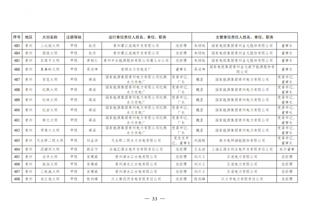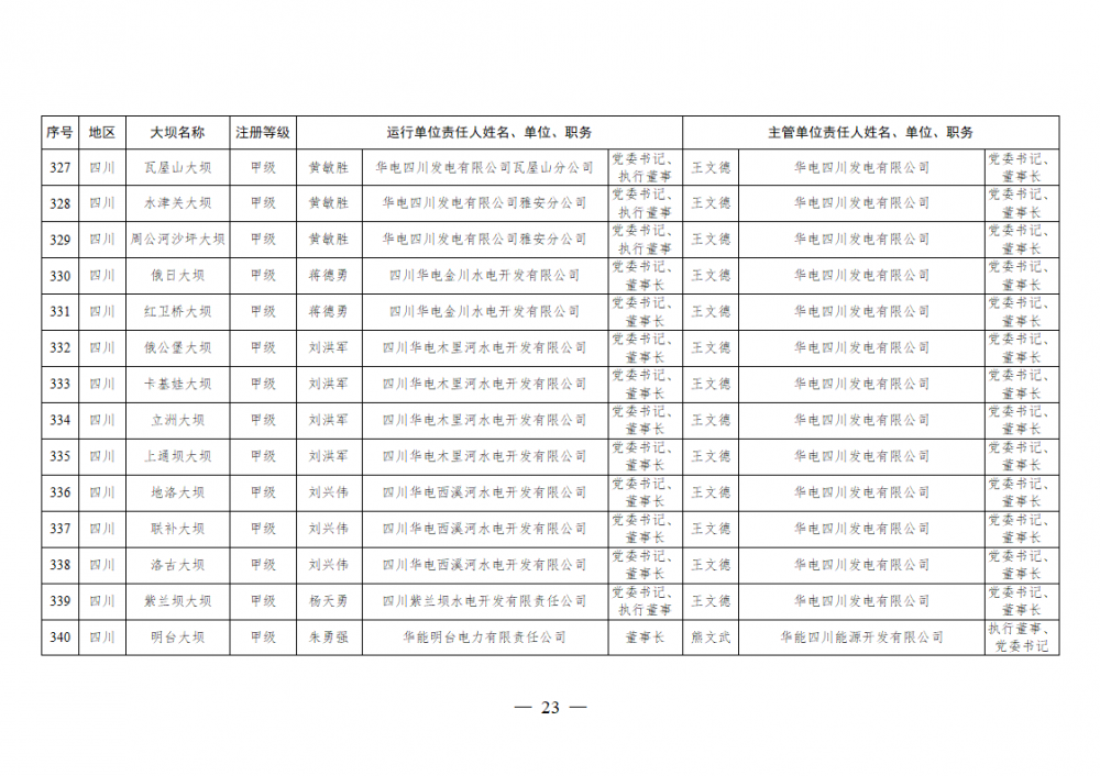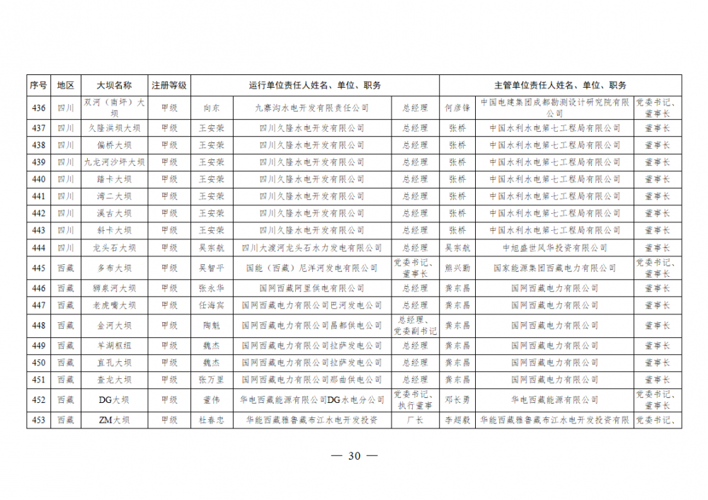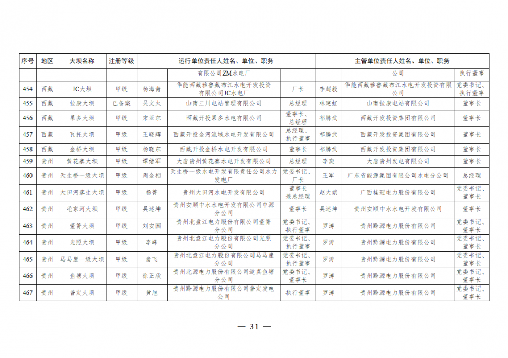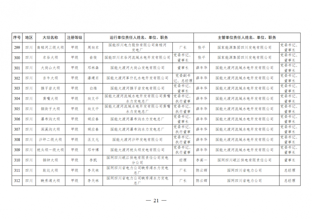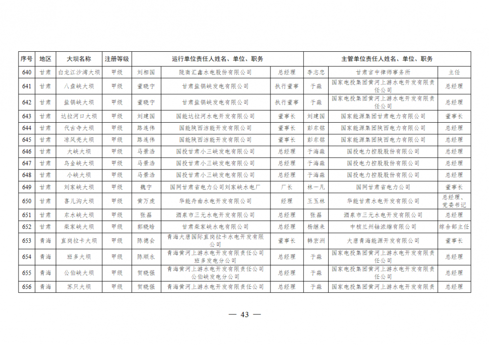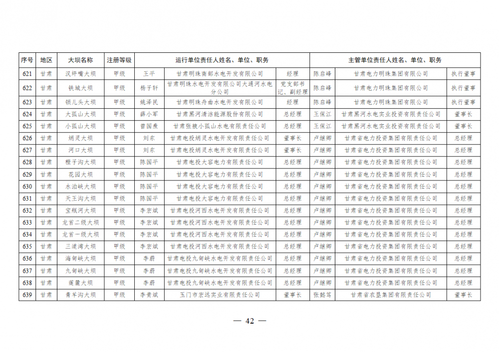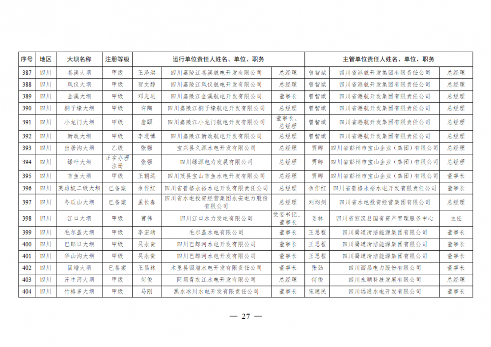 为进一步加强水电站大坝安全监督管理,压紧压实电力企业大坝安全主体责任,按照《水库大坝安全管理条例》《电力安全生产监督管理办法》(国家发展改革委令2015年第21号)、《水电站大坝运行安全监督管理规定》(国家发展改革委令2015年第23号)等规定要求,现将电力行业700座注册登记和登记备案的水电站大坝(以下简称大坝)运行单位及主管单位的安全责任人名单予以公布。