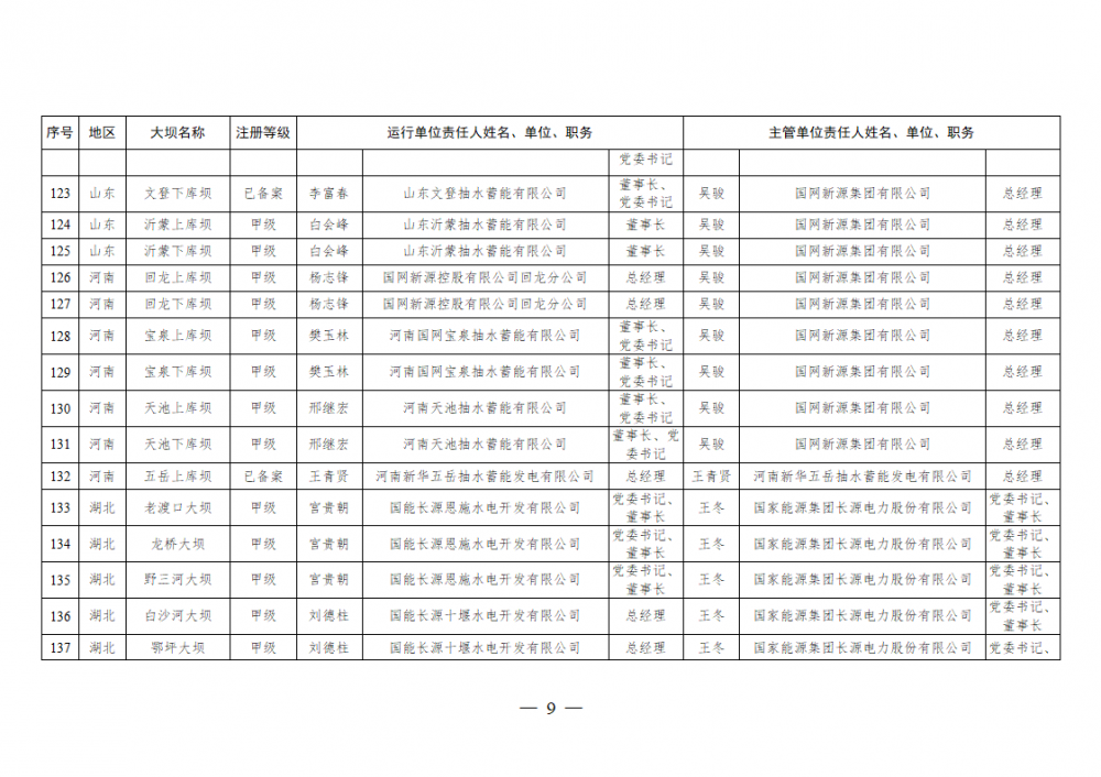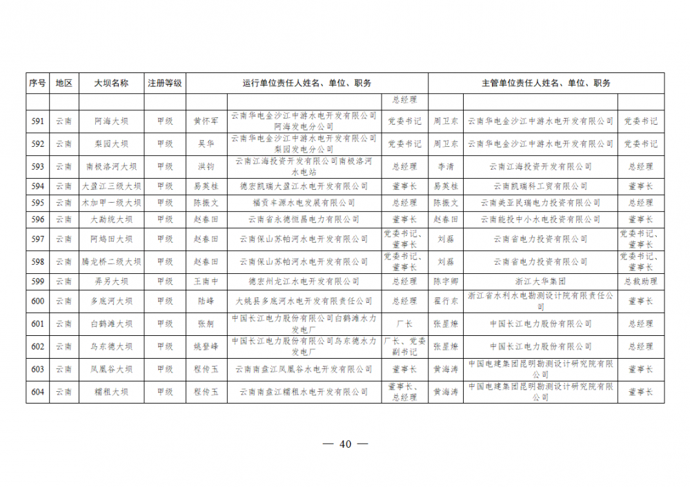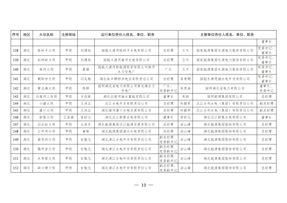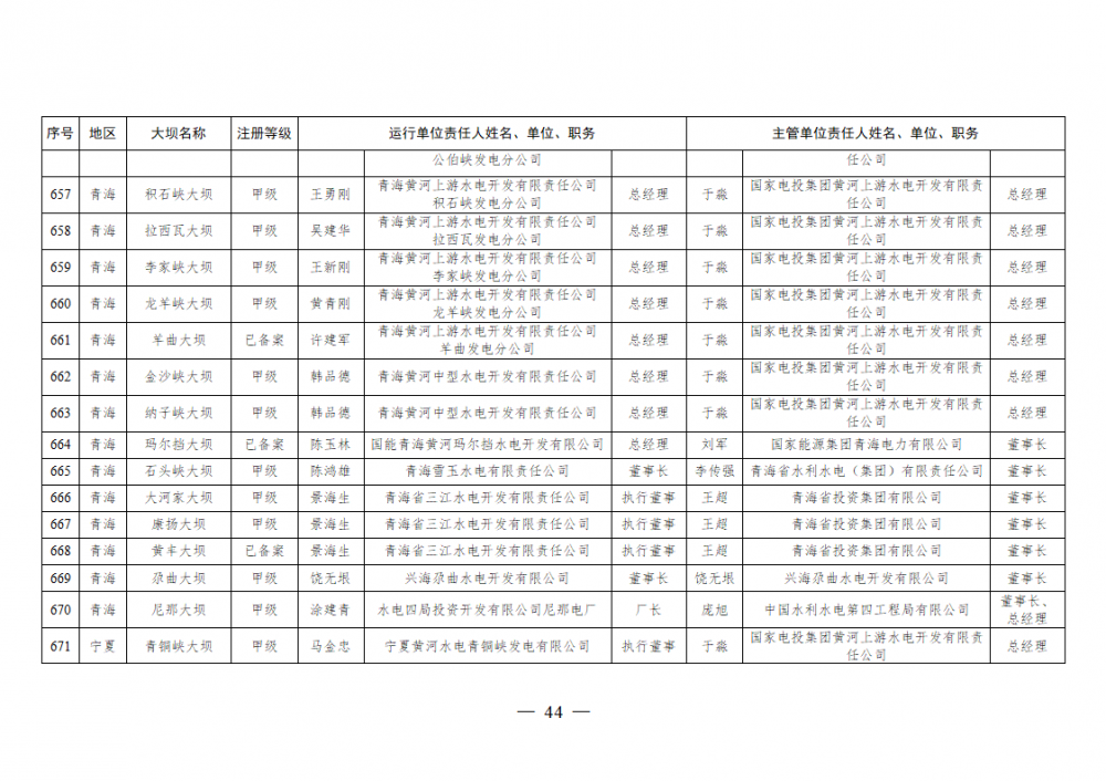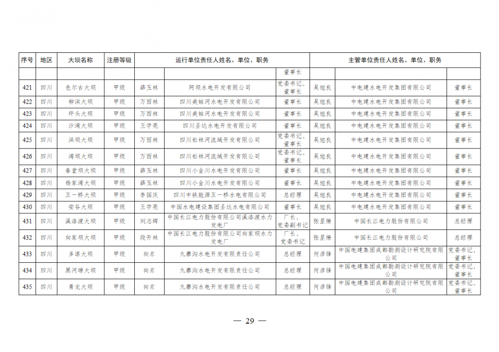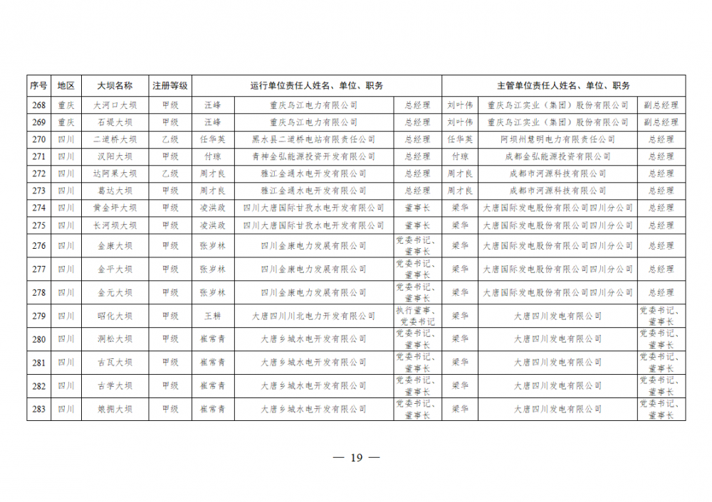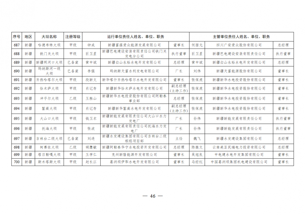 为进一步加强水电站大坝安全监督管理,压紧压实电力企业大坝安全主体责任,按照《水库大坝安全管理条例》《电力安全生产监督管理办法》(国家发展改革委令2015年第21号)、《水电站大坝运行安全监督管理规定》(国家发展改革委令2015年第23号)等规定要求,现将电力行业700座注册登记和登记备案的水电站大坝(以下简称大坝)运行单位及主管单位的安全责任人名单予以公布。