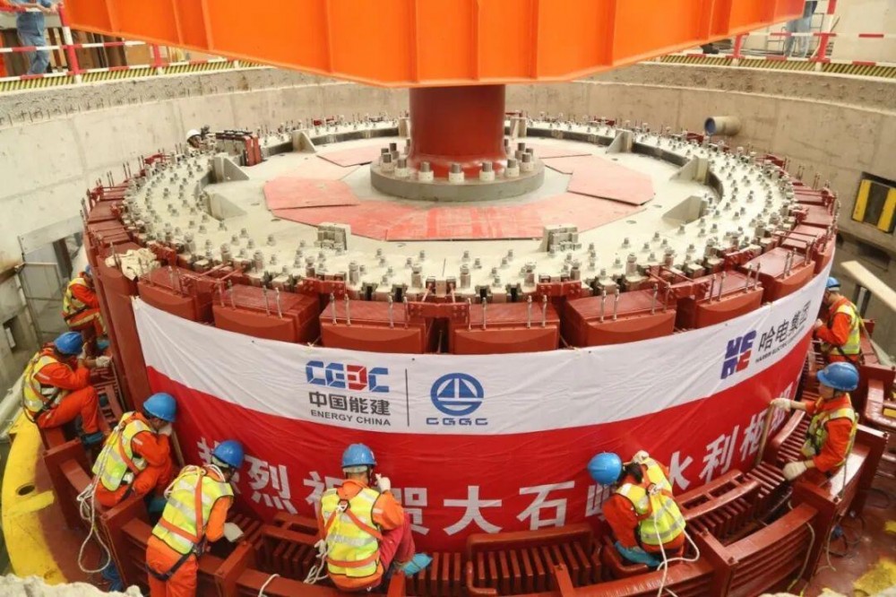 本次吊装的1号机组转子外圆直径7.956米,高3米,总重约560吨,历时1小时45分钟,转子平稳落入既定基坑,顺利完成吊装,电站正式开启投产发电倒计时。