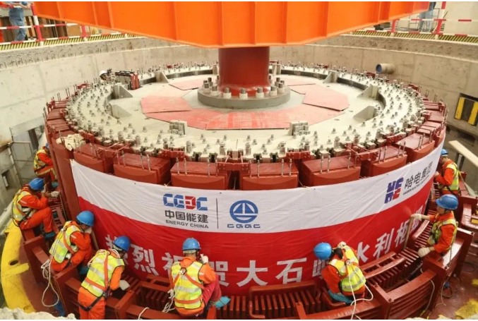 本次吊装的1号机组转子外圆直径7.956米,高3米,总重约560吨,历时1小时45分钟,转子平稳落入既定基坑,顺利完成吊装,电站正式开启投产发电倒计时。