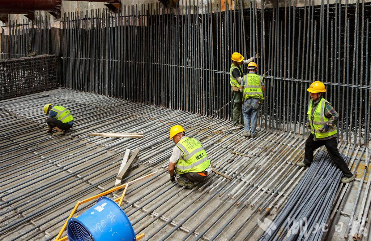 梅林地铁站正在进行车站底板施工,工人们正在绑扎钢筋,为下一步浇筑混凝土做好准备。(湖北日报全媒记者 成熔兴 摄)
