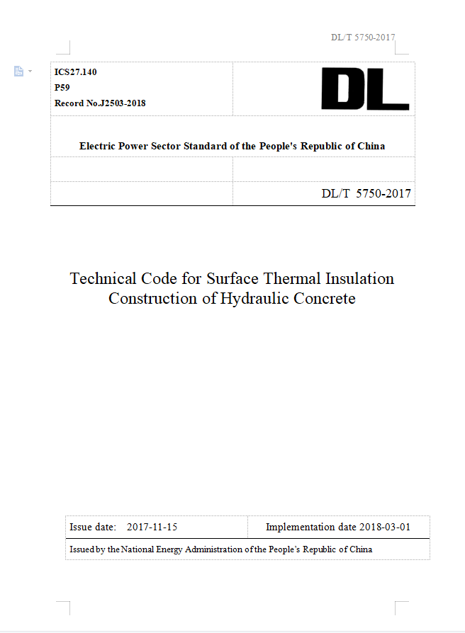 2 | DL/T 5750-2017 | 水工混凝土表面保温施工技术规范 | Technical Specification for Surface Thermal Insulation Construction ofHydraulic Concrete | 中国电力出版社 |