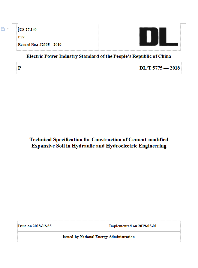 4 | DL/T 5775-2018 | 水电水利工程水泥改性膨胀土施工技术规范 | Technical specification for cement-improved treatment for expansivesoil in hydraulic and hydropower projects | 中国电力出版社 |