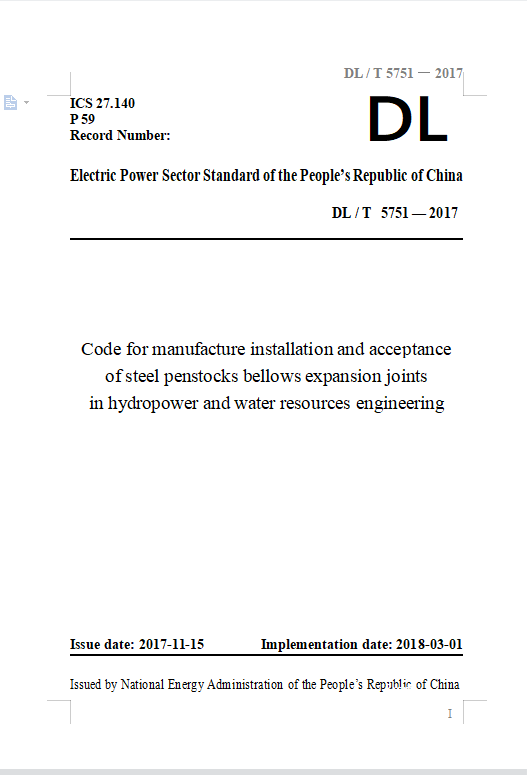 3 | DL/T 5751-2017 | 水电水利工程压力钢管波纹管伸缩节制造安装及验收规范 | Code for manufacture installation acceptance and acceptance ofbellows expansion joints ofpressure pipe in hydropower and waterconservancy p | 中国电力出版社 |