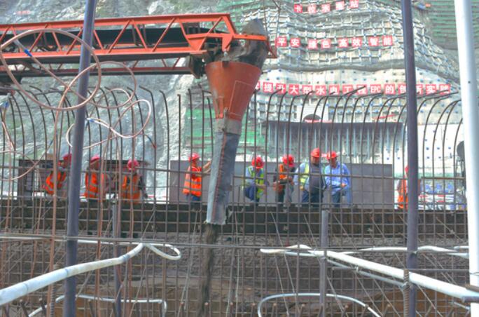 面对底板混凝土体量大、结构复杂以及汛期施工等挑战,项目建设团队建立全流程管控体系,以严控混凝土温度为核心,浇筑前运用布料机进行低坍落度工艺性试验,验证并优化温控方案与操作流程;实施全过程温控措施,严控出机口至入仓温度,运输中采取车辆覆盖隔热、错峰浇筑及仓面喷雾降温。同步辅以内部预埋冷却水管通水散热与表面保温养护,有效抑制温升与温差;创新应用智能灌浆系统,配套投入集中制浆站、布料机等大型设施,构建智能作业体系,实现灌浆参数精准控制与实时监测;针对凉山州雨季特点,成立防洪专项小组,联动气象部门构建“气象-水文-施工”联动预警机制,实施24小时气象信息监测,动态调整施工时序及增设临时排水设施降低降雨干扰;浇筑过程严把质量关,技术人员全程旁站,严格把控配合比、坍落度、入仓温度、振捣密实度及养护条件等关键环节,最终确保首仓混凝土达到内实外光的高标准要求。