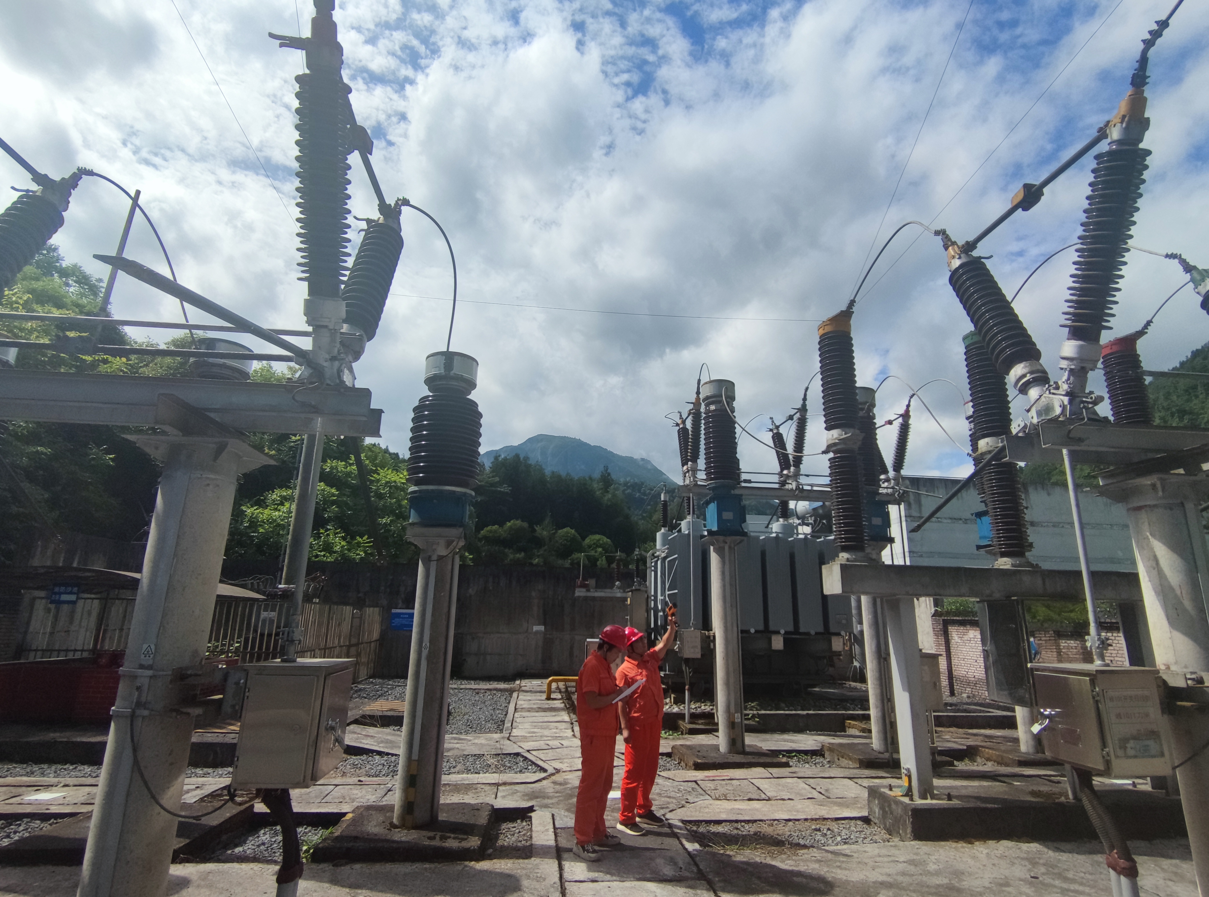 绕主变一圈,运维人员如同“医生”在诊断:“望”油位是否在高温刻度线合理区间、散热器是否正常运转;“闻”运行声响判断电流经过设备是否均匀;“问”同事核对中控室有无异常信号;“切”设备精准检测主变出线套管出线触头温度。确保峰1号主变正常运行后,方孝华继续排查高压侧设备区,用随身携带的测温仪检查开关刀闸的每一个接点,确保电站关键设备在用电高峰期稳定运行。