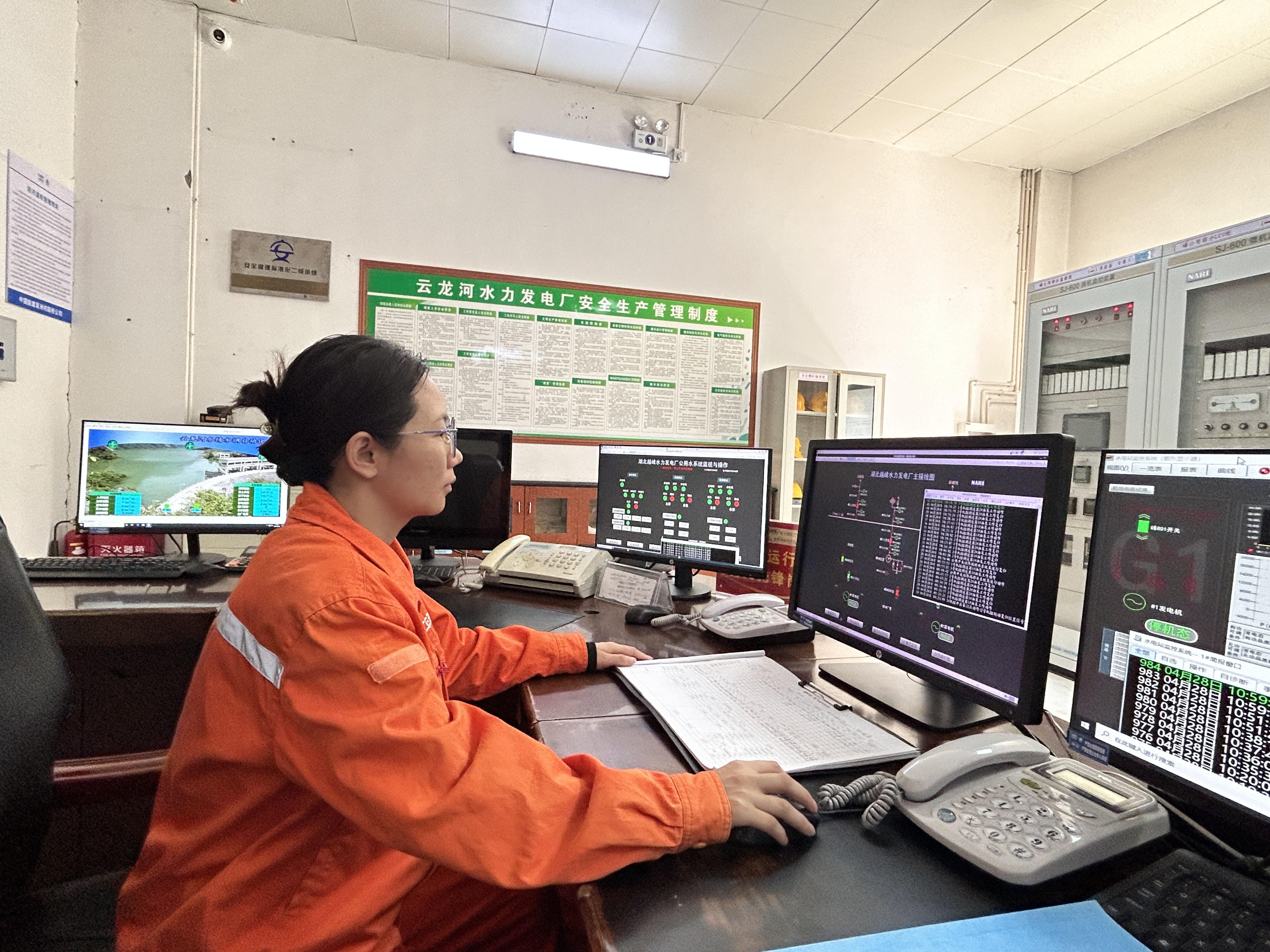 运维人员杨凤正全神贯注地盯着监控画面。作为当值的“指挥官”,她需要协调水库调度、机组运行、设备监控、应急处置等方方面面,确保每一度电都安全、稳定、高效地送入电网。