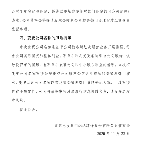 11月22日,远达环保发布公告称,公司于11月21日召开第十届董事会第三十五次(临时)会议,审议通过了《关于增加注册资本、变更公司名称并修订公司章程的议案》。为全面匹配公司重大资产重组后的业务战略转型,精准凸显水电主业核心定位,强化品牌主业辨识度,公司拟变更公司名称,由国家电投集团远达环保股份有限公司变更为国家电投集团水电股份有限公司(暂定名,以工商部门核名为准)。