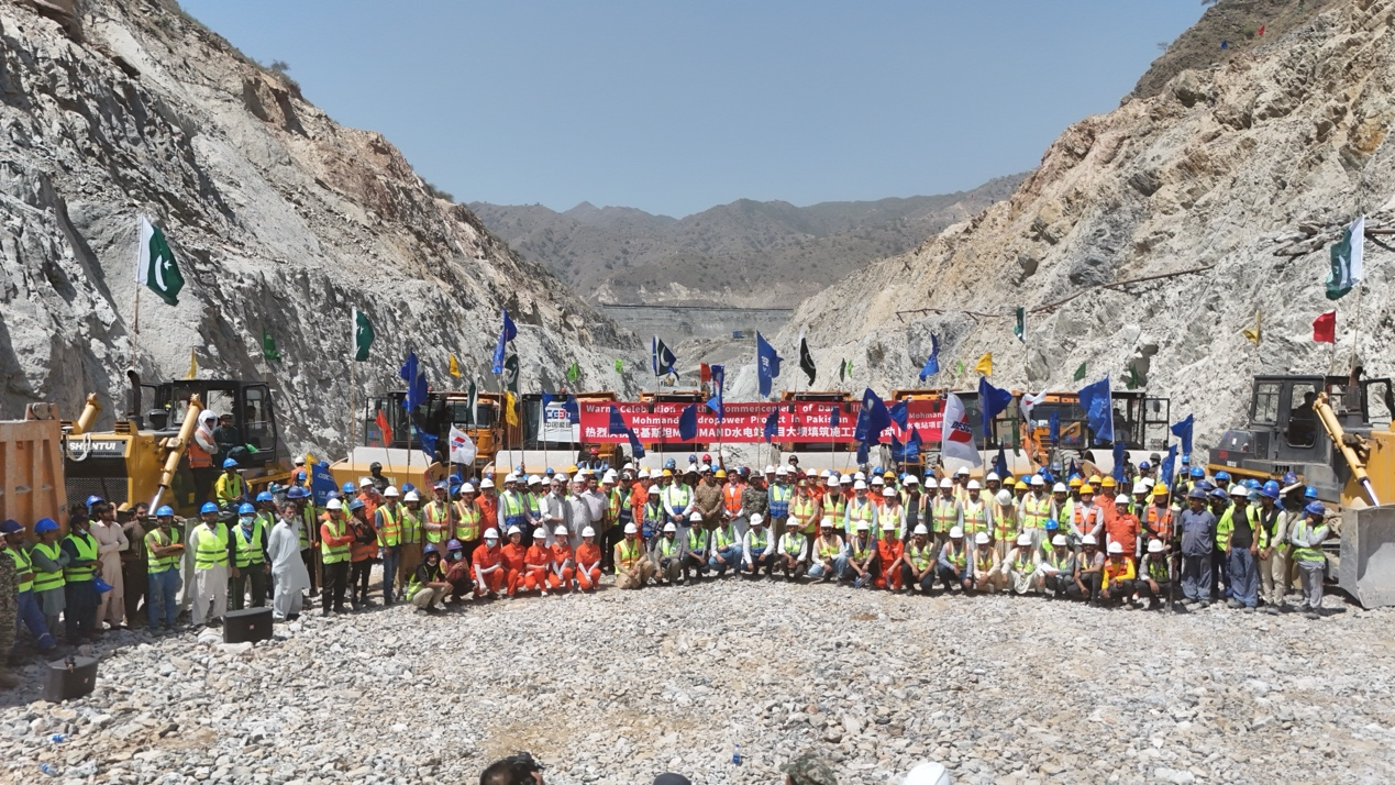 图为中巴双方施工人员在莫赫曼德水电站项目大坝填筑施工启动仪式上合影。中国能建葛洲坝集团供图